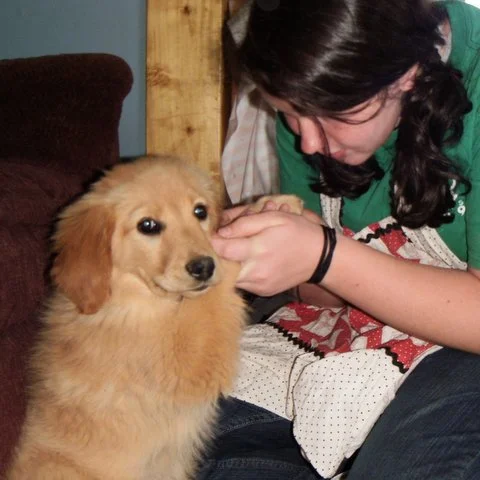 Aria’s first college/mission fund puppy was a beautiful purebred Golden Retriever with near-perfect conformation, but most important, she has a sweet personality and is obedient and intelligent. Happy is the most mellow and calm, the largest of our moms. Her wait list was usually nice and long, since she had a fan club for her beautiful puppies. She is in her retirement home where foster kids and dog sitting is the norm. She is still serving and loving!