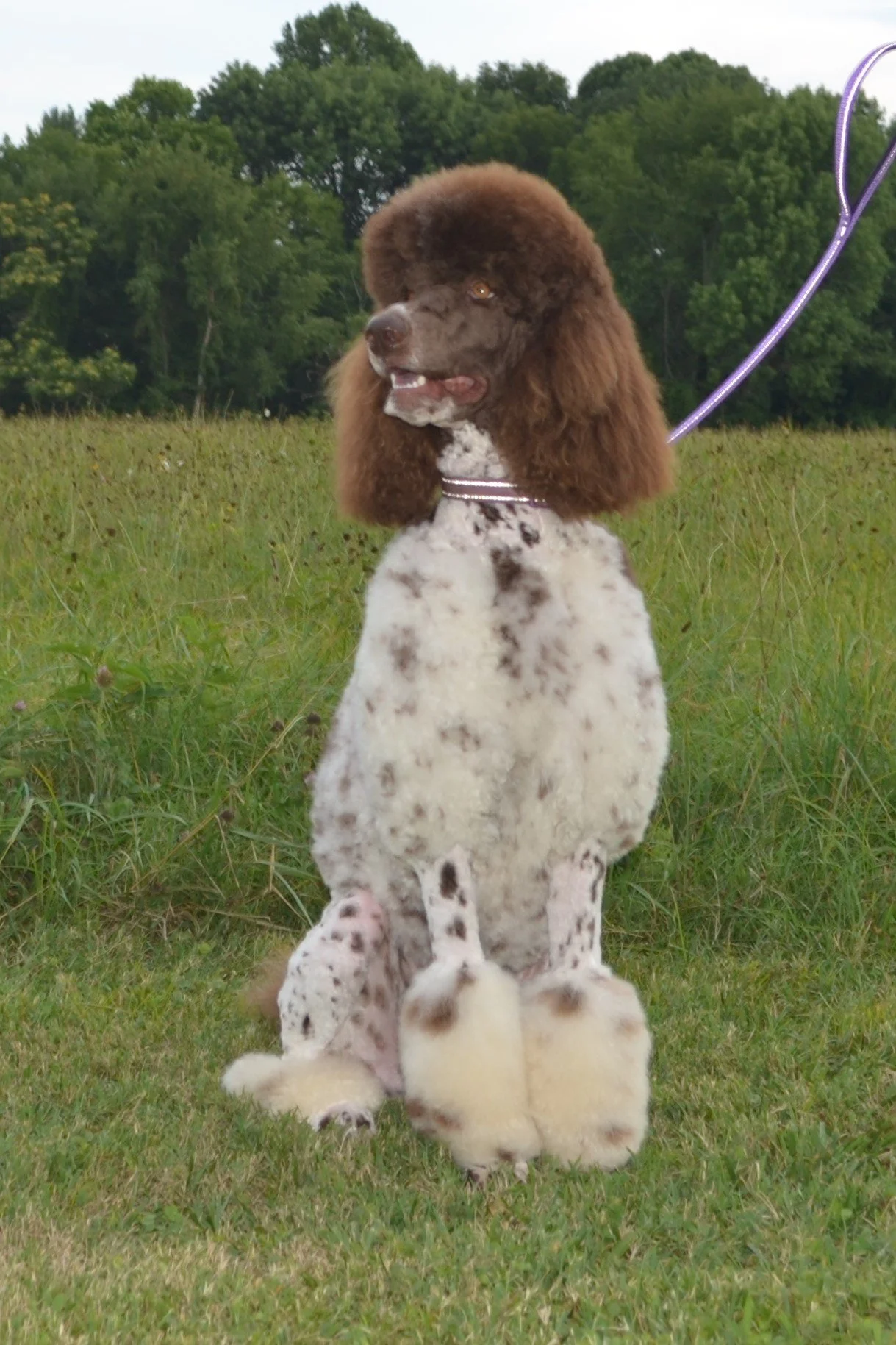 Bean is a stunning brown and white parti poodle with a great temperament and impressive conformation. He is exceptionally smart and affectionate, he loves to run and play and often gets dirtier than we would like! He was born March 2021 and he is now 26 inches tall and 60lbs! He’s a very impressive stud and we expect wonderful puppies in the future! Bean is the first stud that has been one of the kids dogs, Sage loves him very much and takes excellent care of him. Once Bean turns 2 he will have his OFA certifications completed.