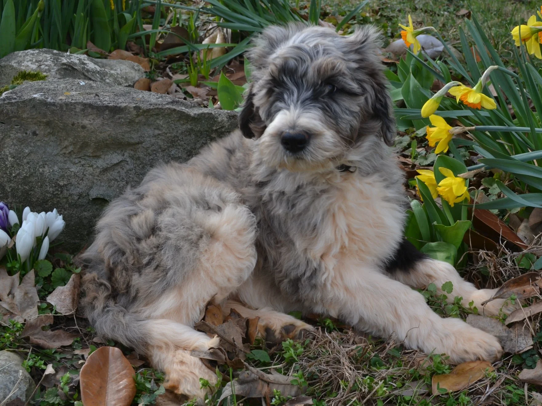 Six-week puppy with blue merle coloring laying in front of a rock with yellow daffodils to the right and white crocuses to the left.